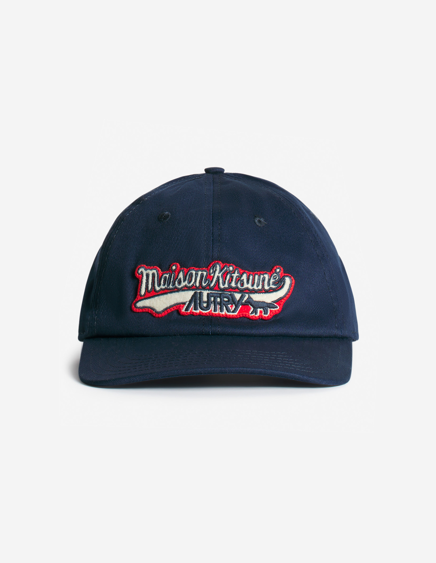 Maison Kitsuné x Autry联名六片式棉斜纹棒球帽,配刺绣学院风贴章和对比色双品牌标志,可调节式搭扣。
