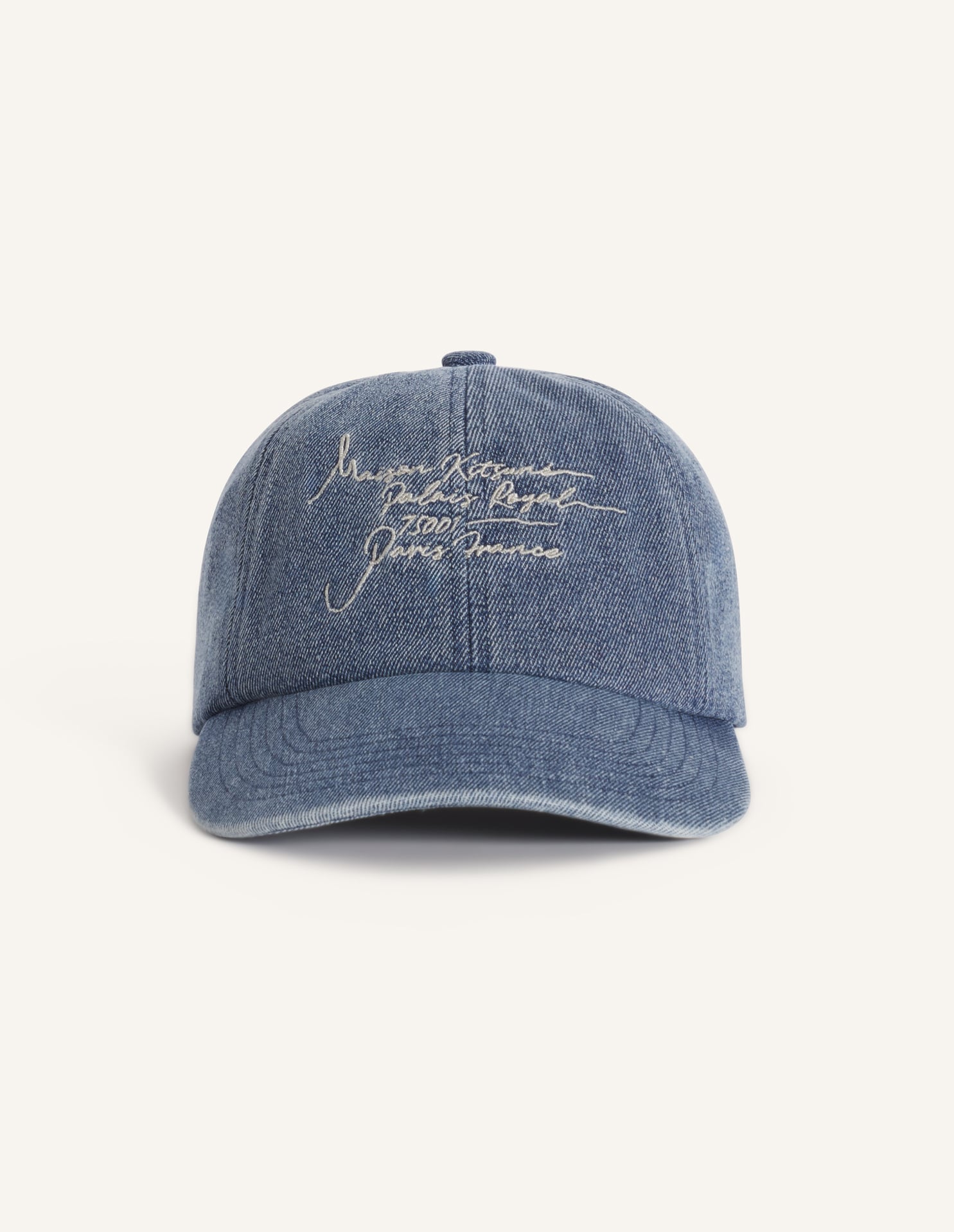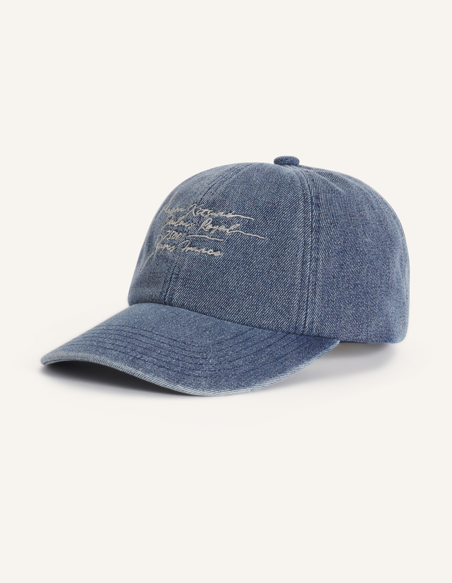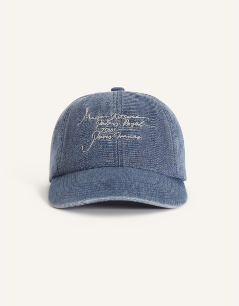 Denim cap. Poetic Script embroidered on the front.